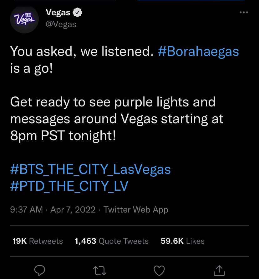 To celebrate K-POP group BTS and welcome millions of fans to Las Vegas, LVCVA launched a culturally resonant campaign by turning the city purple — the symbolic color of BTS and their fanbase, ARMY. The campaign, titled #BORAHAEGAS, transformed digital and physical spaces with purple visuals to show support, create buzz, and drive organic engagement. Fans were encouraged to tag sightings of the campaign, turning them into ambassadors of the experience.